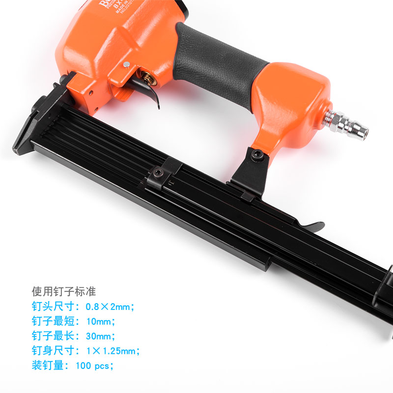 • 產(chǎn)品參數(shù): 釘腳尺寸:1×1.25mm;使用釘子長(zhǎng)度范圍:10-30mm;裝釘量:100個(gè);重量:1.2kg;使用工作氣壓:0.6Mpa;推薦使用內(nèi)徑6.5mm氣管;平時(shí)多注意定時(shí)排放空壓機(jī)水份
