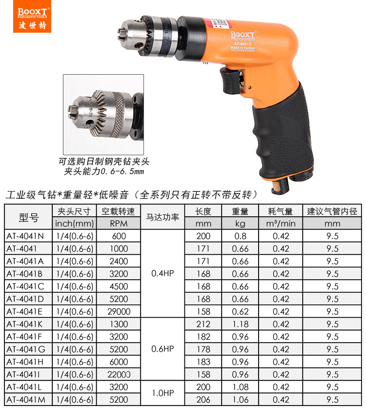 東莞市強勁五金工具有限公司提供臺灣BOOXT波世特品牌氣動工具,1000轉(zhuǎn)小型氣動鉆AT-4041廠家直銷,首件享特價。咨詢熱線:4008301980