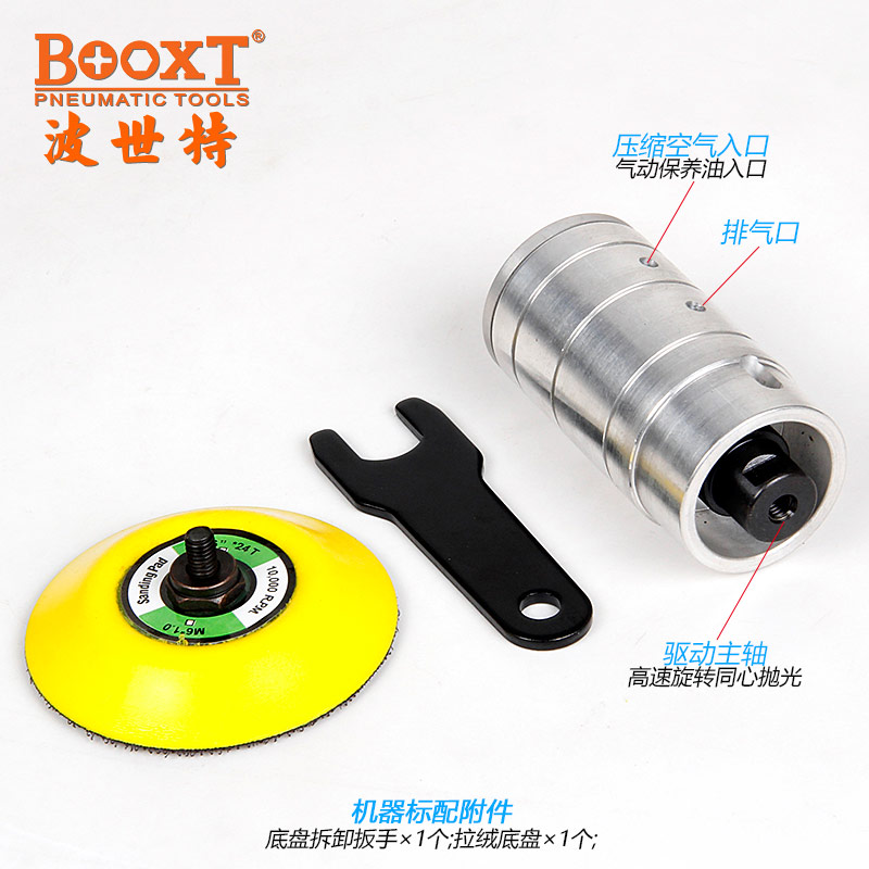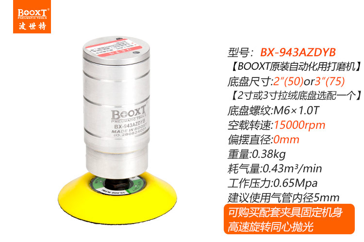 • 產(chǎn)品參數(shù): 底盤尺寸:50mm/75mm (2寸/3寸) 偏擺直徑:0mm 空載轉(zhuǎn)速:15000rpm 重 量:0.38kg 耗 氣 量:0.43m3/min 【同心/高速】