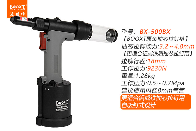 東莞市強(qiáng)勁五金工具有限公司提供臺灣BOOXT波世特品牌氣動工具,自吸氣動拉鉚槍BX-500BX廠家直銷,首件享特價。咨詢熱線:4008301980