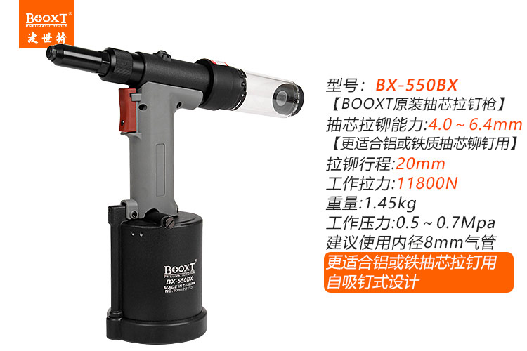 東莞市強(qiáng)勁五金工具有限公司提供臺灣BOOXT波世特品牌氣動工具,自吸氣動鉚釘槍BX-550BX廠家直銷,首件享特價。咨詢熱線:4008301980