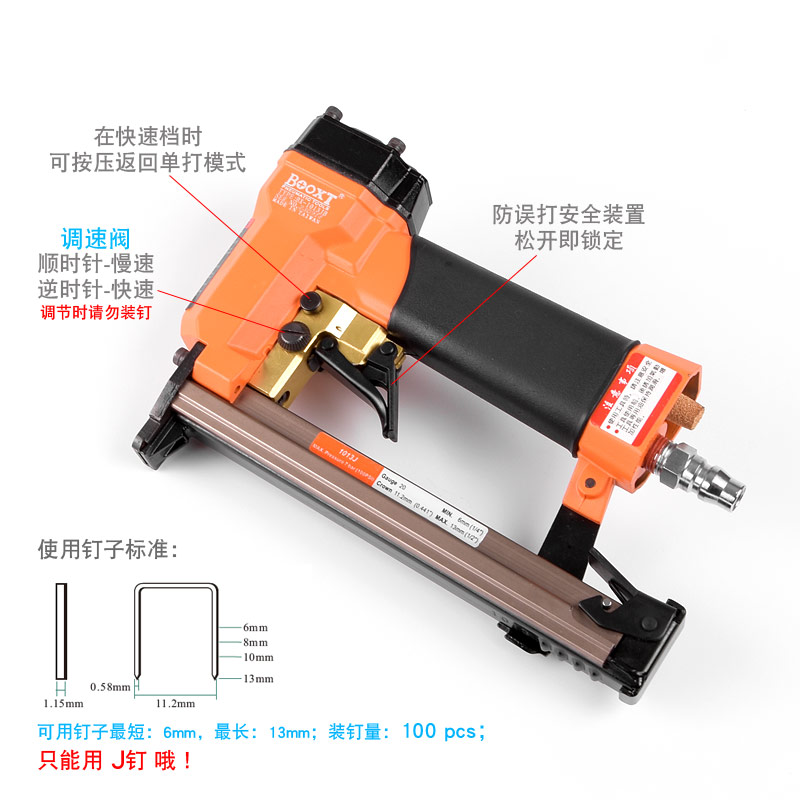 • 產(chǎn)品參數(shù): 特點(diǎn):可調(diào)節(jié)快速連打,自帶防誤打安全開關(guān);釘子寬度:11.2mm;釘子跨度:10mm;釘腳尺寸:0.58×1.15mm;使用釘子長度范圍:6-13mm;裝釘量:100個(gè);使用工作氣壓:0.6Mpa;推薦使用內(nèi)徑6.5mm氣管;平時(shí)多注意定時(shí)排放空壓機(jī)水份